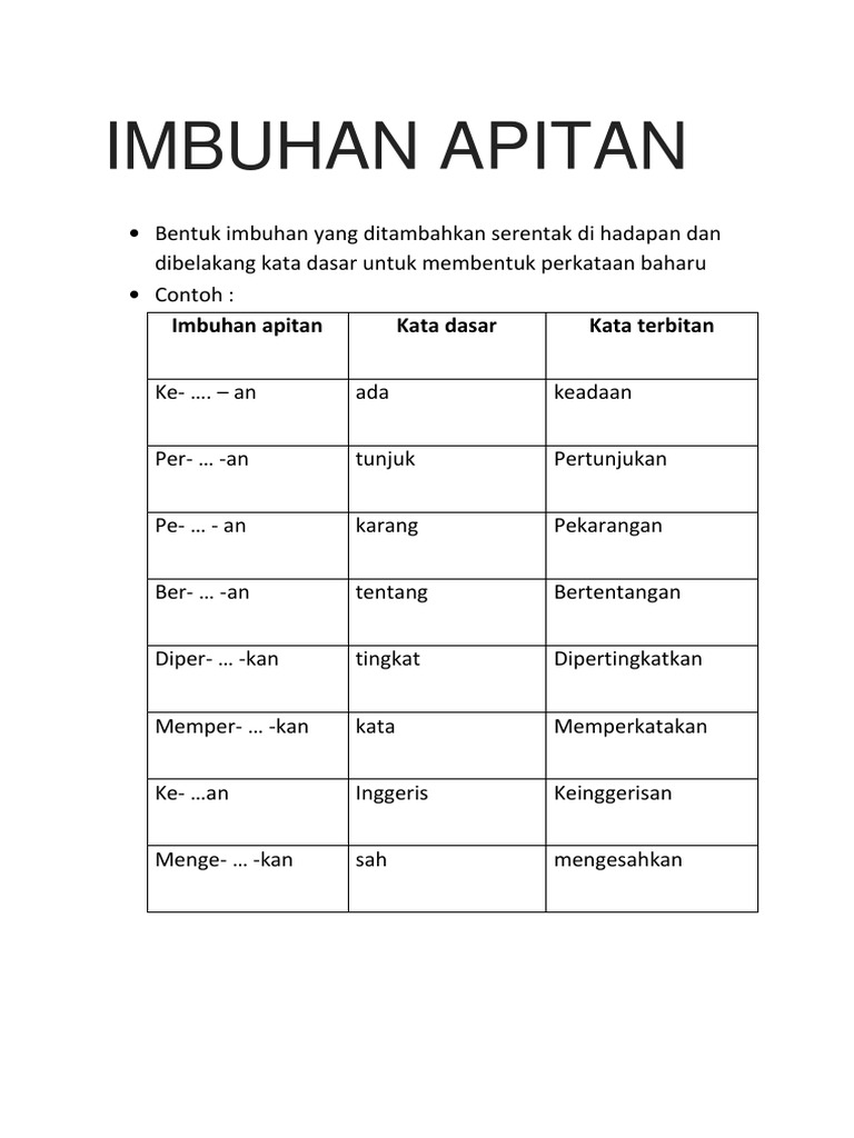 Soalan morfologi akan ditanya pada Kertas 2 viii Apitan kata adjektif PAN ASIA PUBLICATIONS Bahagian A Sistem dan Aplikasi Bahasa. Tradisi Apitan adalah tradisi sedekah bumi yang biasanya dilakukan oleh masyarakat Demak setiap satu tahun sekali. Imbuhan apitan ialah imbuhan yang ditambahkan serentak pada hadapan dan pada belakang kata dasar.